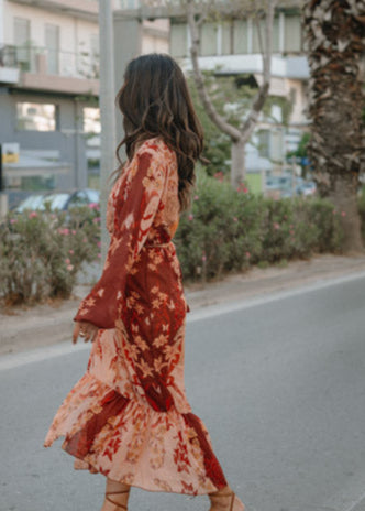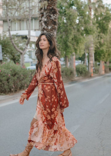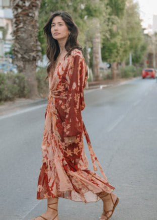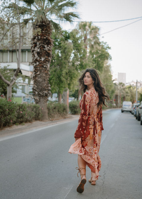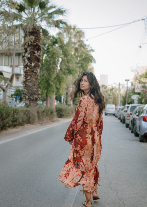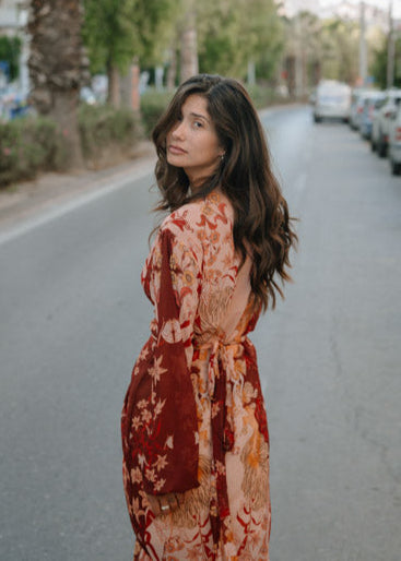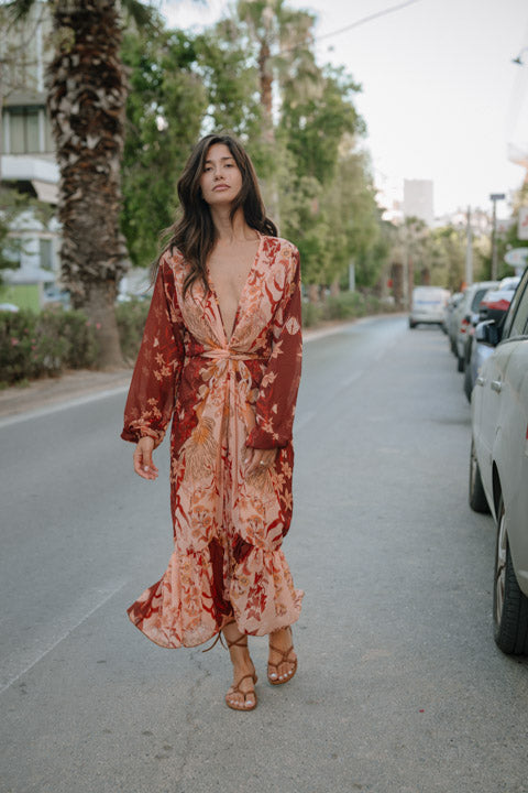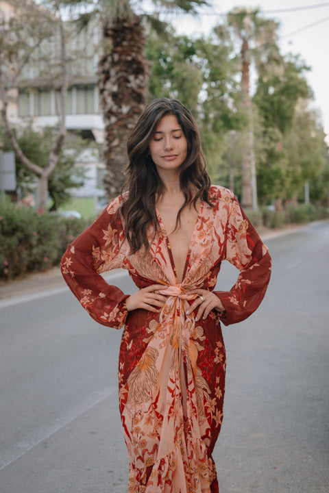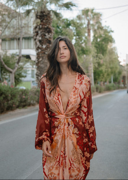 A midi wrap kimono in our favorite print, for this season. Wear it as a dress, from morning to night, or open like a kimono on the beach. Nude underskirt included.